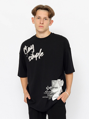 Футболка oversize со спущенным плечом, с коротким рукавом. Горловина круглая, обработана притачной бейкой из рибаны с лакрой. Плечевые швы смещены на перед и отстрочены. По переду вдоль правого бокового шва - текстовый принт.